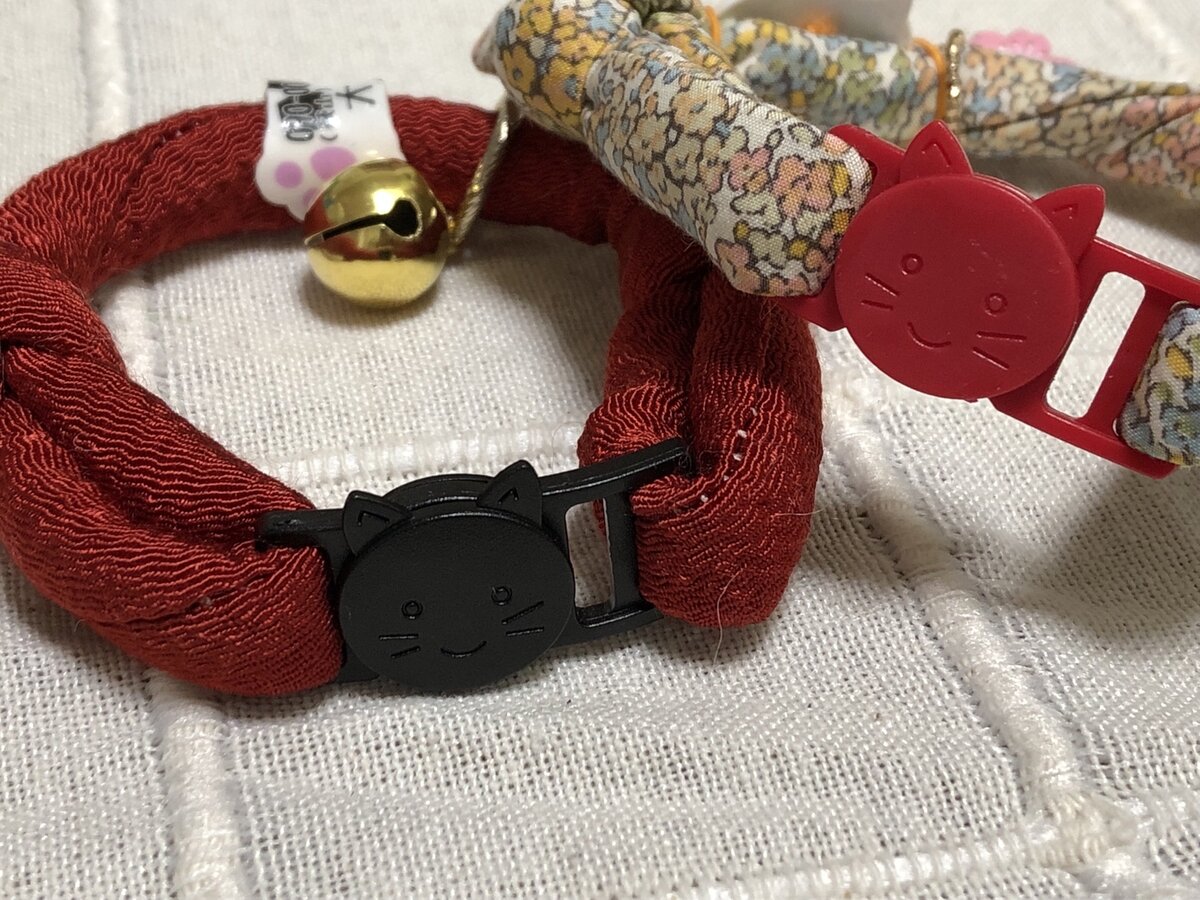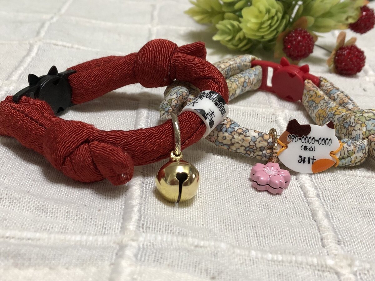 オリジナルの迷子札付きの首輪になります。デザインは和柄とリバティーです和柄は和布や縮緬を使用することがあります。バックルはセーフティーバックルで大切な猫を守ります。 サイトで販売中です。