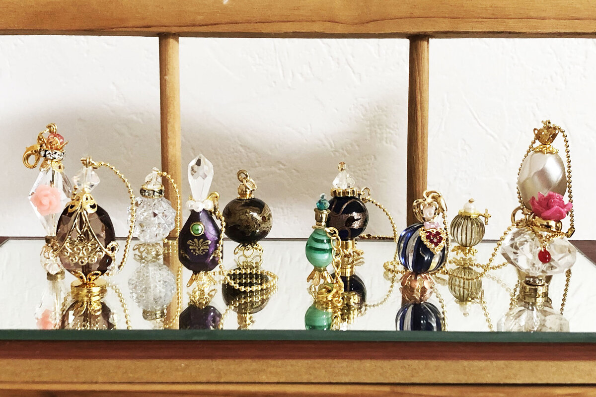 変わった形のビーズがあるとついつい作ってしまいたくなるミニチュアの香水瓶素材はいろいろです。ガラスやアクリル、ウッドビーズなど使っています。